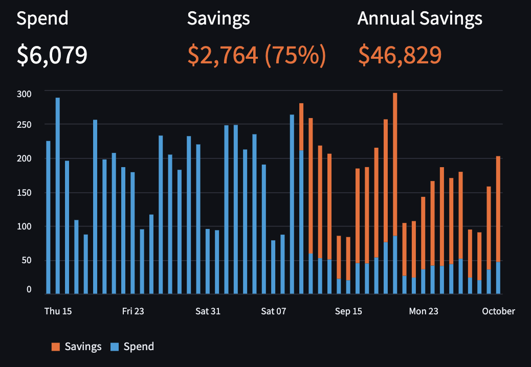 Espresso used two weeks of historical workload metadata to train our optimization models. Within 48 hours, we turned around a savings estimate which projected up to 75% savings in production. Then Accredible switched Espresso on and instantly saw the savings in production.